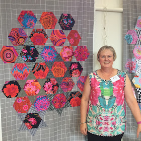 On Saturday morning we left home at 8am for the full day workshop organised by Busy Bee Quilt Shop of Wellington. We both had a great time because we went with open minds, and were willing to try anything Kaffe or Brandon suggested. We didn't cut any fabrics before we went, and were pleased that we hadn't. Kaffe started by explaining what we should aim to achieve with the pattern, and we all went off to cut large hexagons for an hour.